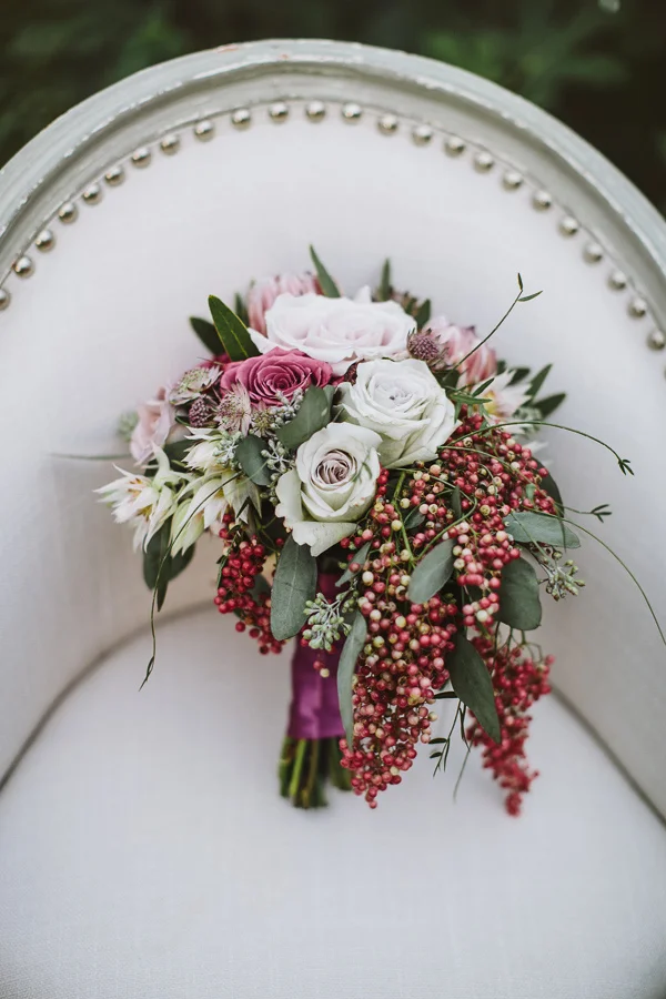 uns dias atrás, falando de ramos de noiva, prometi algumas imagens de ramos mais pequenos, contrariando a onda actual de braçadas descomunais de flores, ou, autênticas bolas de futebol. Eu direi que o ramo ideal (se acaso existe), tem que vestir a noiva, à semelhança do vestido, não pode ser um elemento que se sobreponha a todos os outros, harmonia, delicadeza e aquele detalhe especial é, atrevemo-nos a dizer, o conjunto ideal. O ramo mais pequeno abre todo um leque de opções - em preço, em conforto de quem tem que o carregar e, o mais desafiante, mostrar com pouco a beleza perfeita da natureza. As nossas propostas vão quase sempre no sentido do ramo mais rústico (mas nem por isso menos elegante), porque é o pedido mais ouvido - um raminho de flores do campo, despretensiosas, mimosas mas cheias de presença. Para este, tudo foi mesmo colhido no campo - as rosas perfumadas de jardim que estão agora a despontar, e como companhia os verdes, desde as aromáticas fortes e bonitas - santolina marítima, alfazema rústica, e as folhinhas de oliveira que estão a brotar em força. Para a assinatura final, o jasmim que neste caso tem um nome muito sugestivo - Galan de Noche, para deixar uma noiva ainda mais enamorada. Espero que gostem.